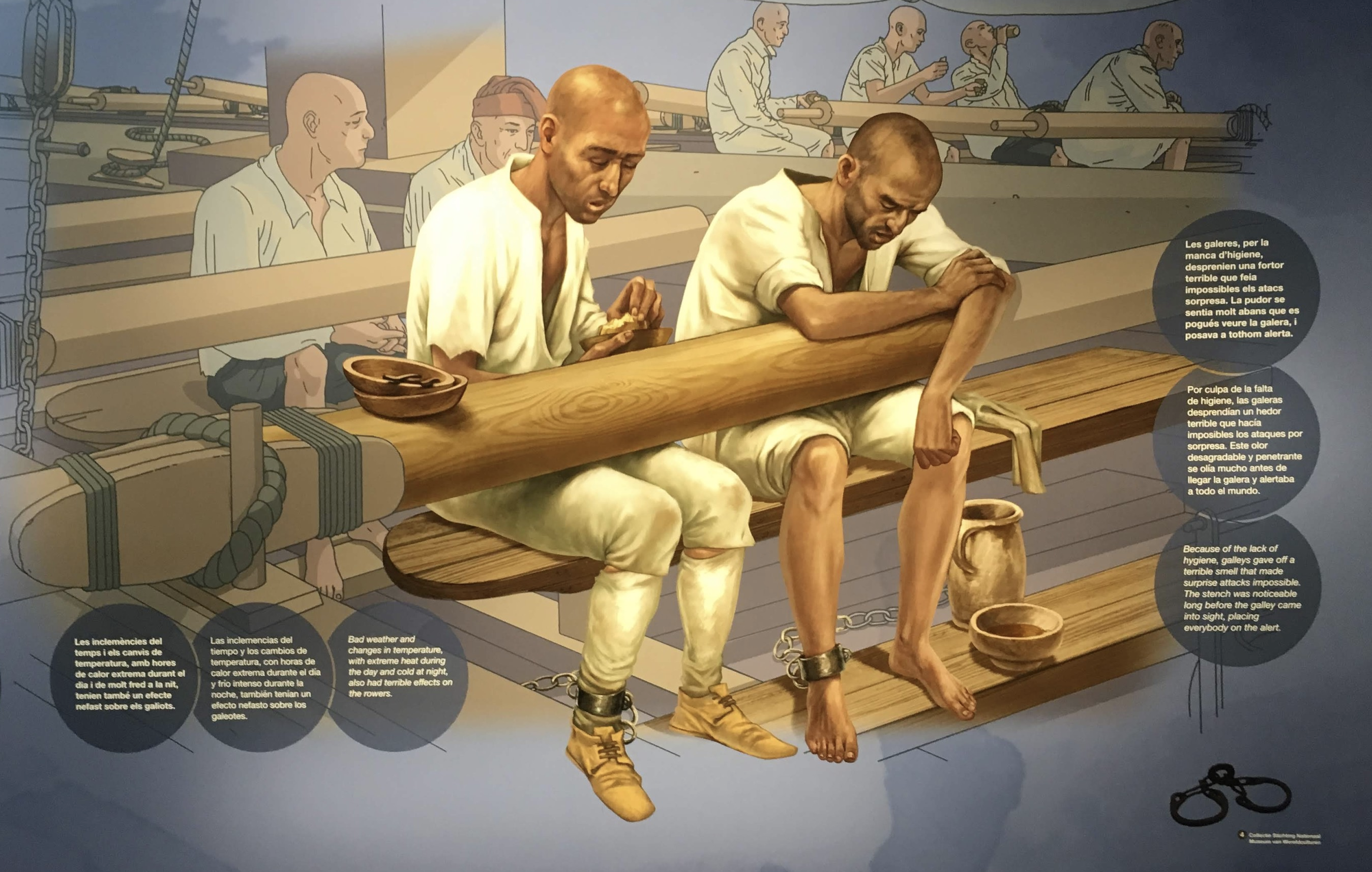Various histories are told, from the development of the shipyard and maritime trade as part of the history of Barcelona. The most revealing and shocking is to contemplate the lot of a man shackled to a bench to work out his life as a galley-slave.