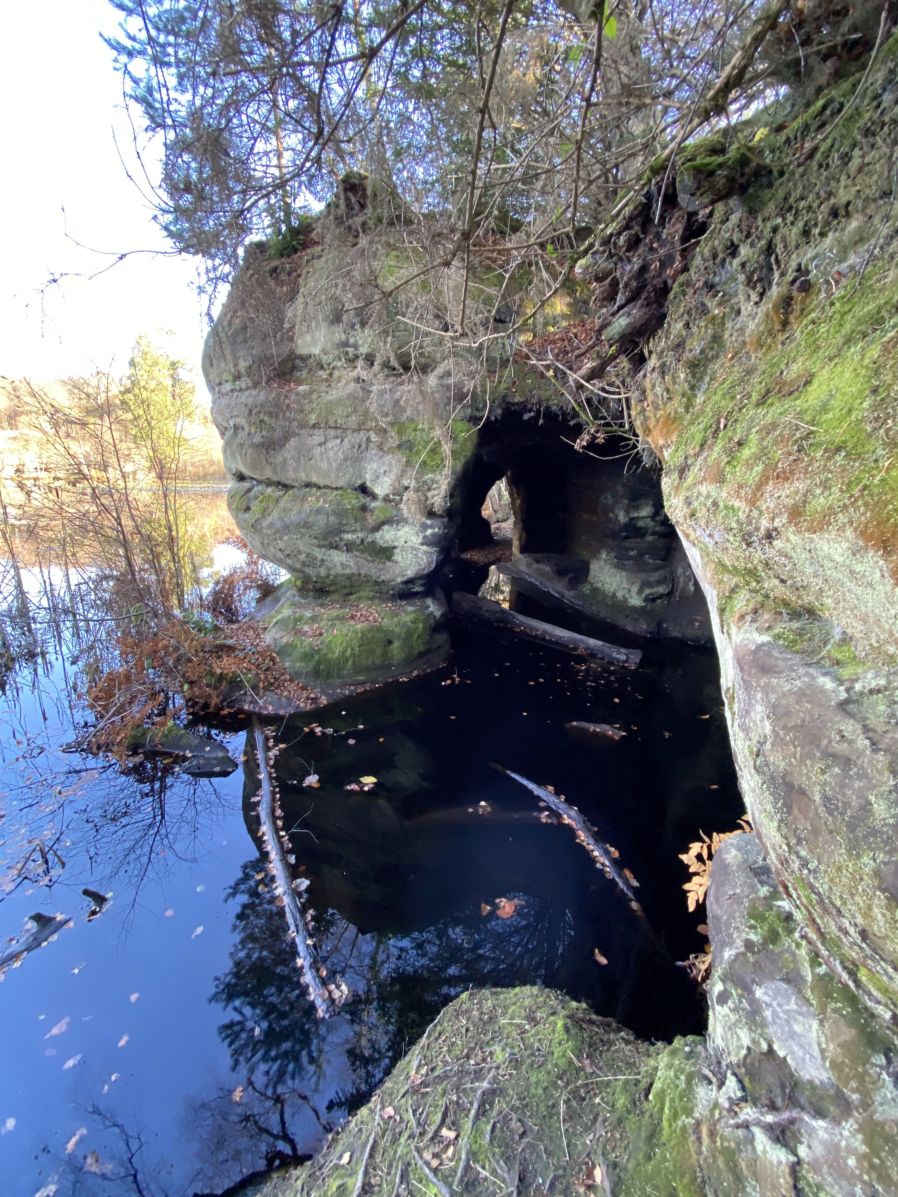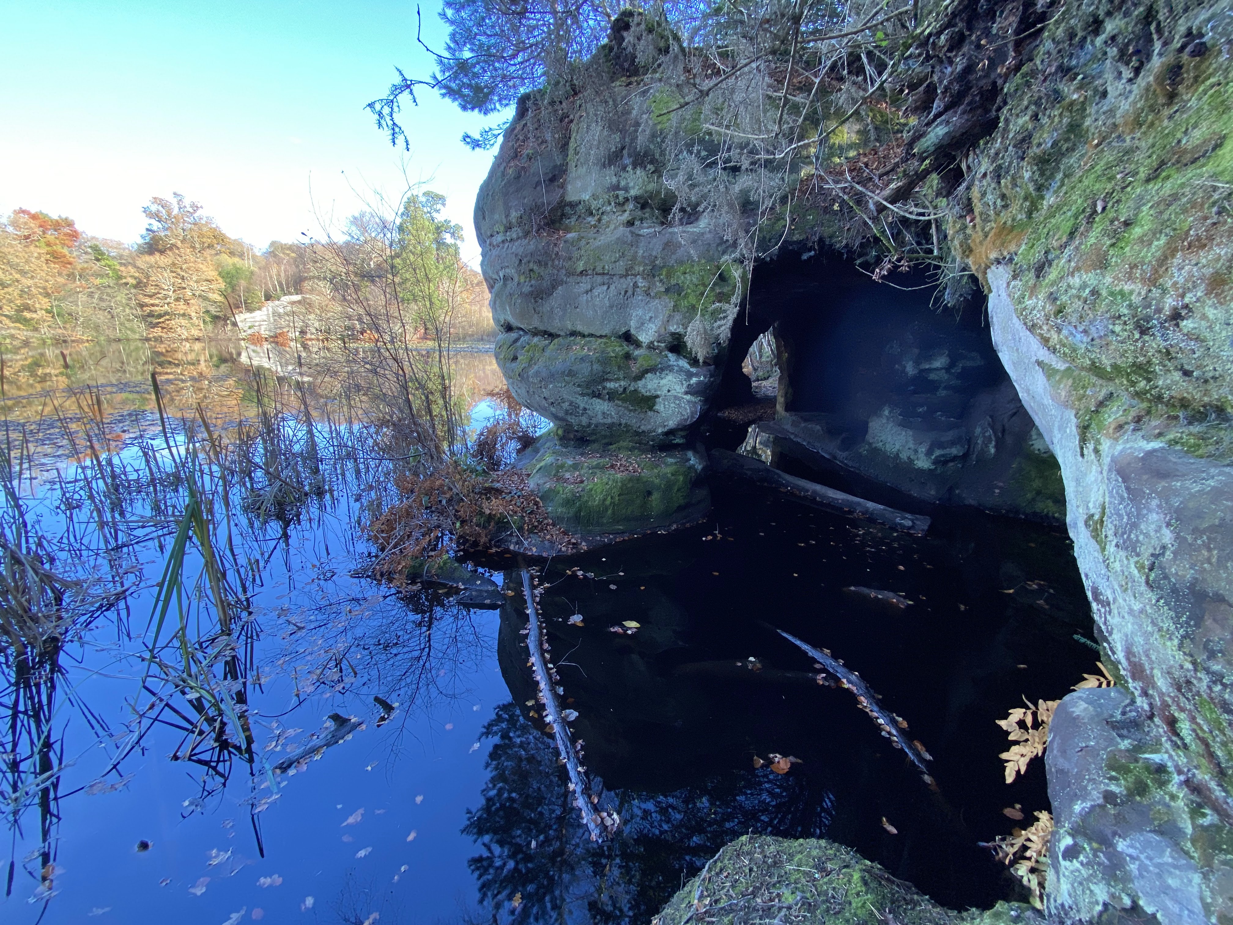 The lake is the creation of Capability Brown and the rides around the lake, including a tunnel through the rocks, were designed for carriages. Excotic trees were planted, many of which survived. Steps, tunnels and a boathouse were cut into the rocks at the time too.