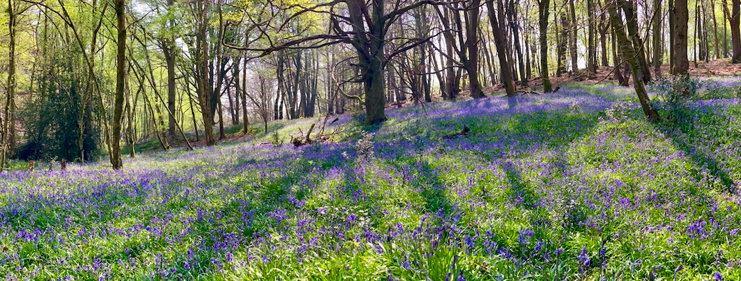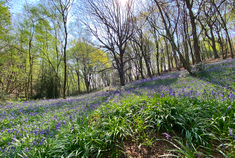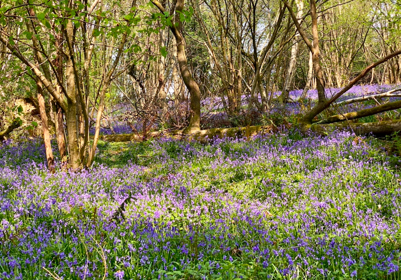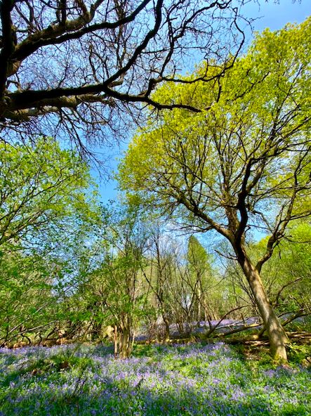 I read up on any Woodland Trust wood in advance and enjoy the detail that comes from each wood’s Management Plan. Much can change in a wood over four weeks, in this case,as I hoped, the bluebells were out in modest clumps by tree stumps, and in huge carpets under the still open canopy of the older deciduous trees.