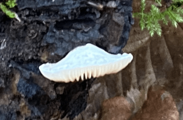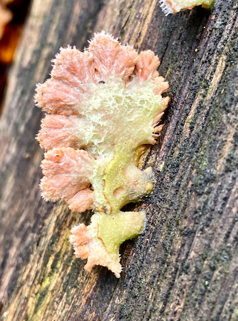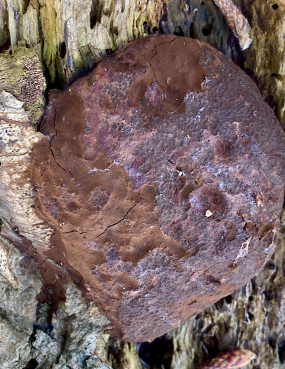 At the north gate, straight in front of you, there’s a length of log, which at different times has some kind of crust on it (Bleeding Broadleaf crust perhaps) and currently, some dehydrated split gill hanging on from last December.