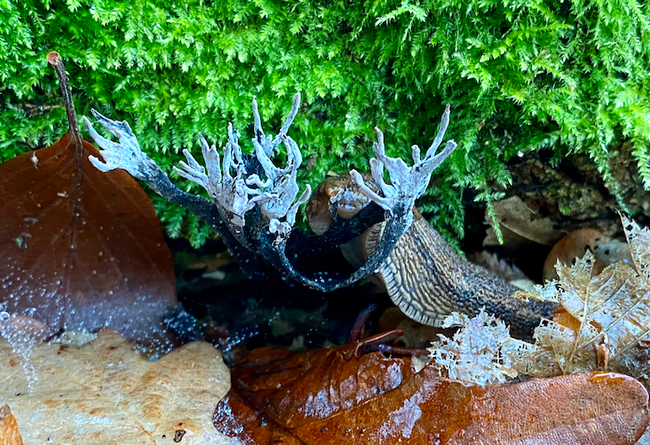 Duck into the woods to find a long fallen, moss covered beech, with a dead Hornbeam companion and a younger Hornbeam that has exploited the tree’s demise, where I first spotted and was amazed by Porcelain, but home to others: