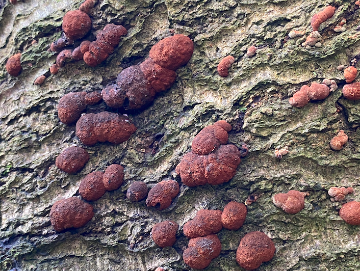 Crusts of many kinds can be found all over the place: bright orange, darker, paler – in curtains, veils, lines, ribbons, Turkey tails and more … but for now, here’s a spot, probably because of the water, where for now there is always some. I could show a set of slides on these alone.