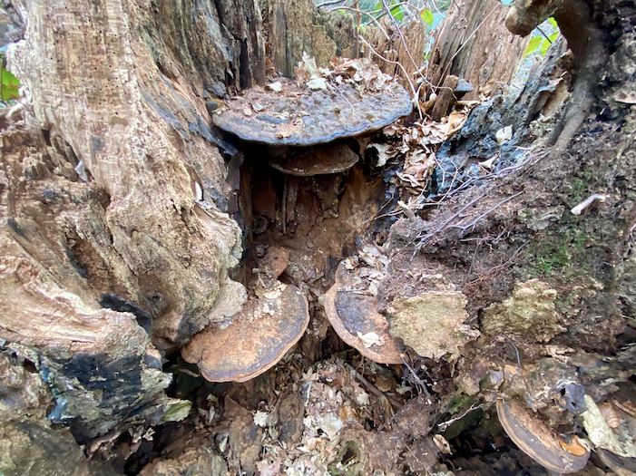 Anyway, it was noted that there were bracket fungi in a hallowed stem then, in 2010, these were still vibrant and present, some of them probably several years old. The rest of the tree is down, and hosting its own fungi. This is artist’s bracket fungus, also known as the artist’s conk