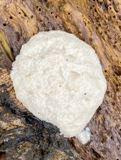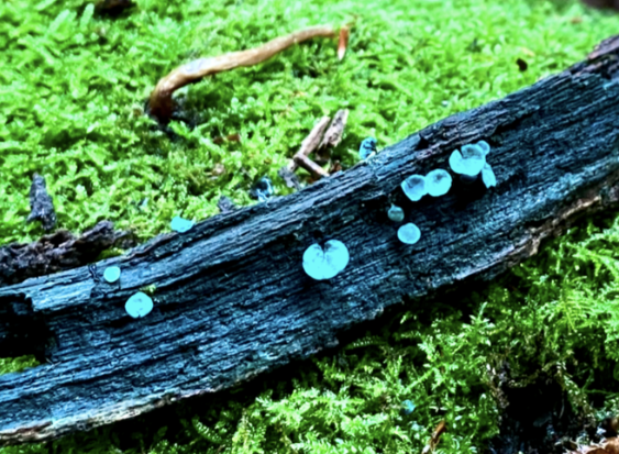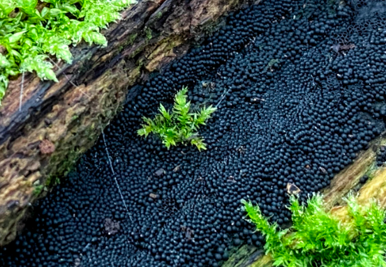 Slime mould appears on the most decayed, broken trunks and boughs around the wood.