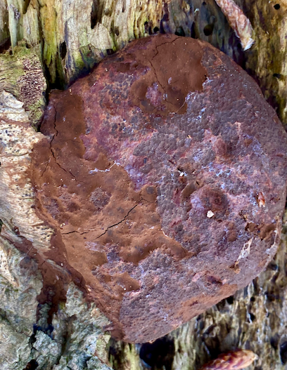 Further down the fallen trunk, there’s a branch that looks like the head of a rocking horse that develops a quite complete covering of Turkey Tail.