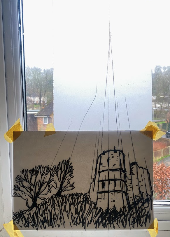 Perspective Challenges: To accurately capture the geometry of the castle, I initially attempted a two-point perspective. I then constructed a lightbox and a light frame, allowing me to place and trace images against the front window. Additionally, I used a longboard to create perspective lines extending far from the picture.