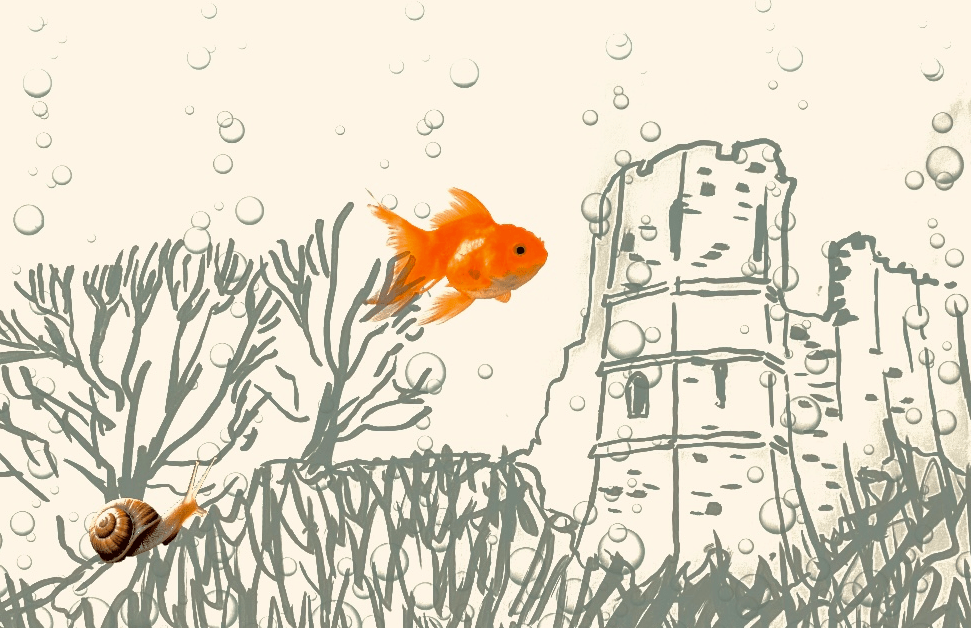 - An aquarium version—mound, castle, and trees submerged like a ceramic ornament.