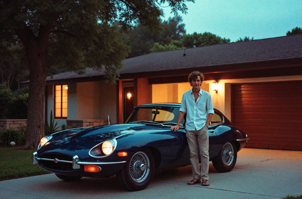 The car here embodies desire versus duty, the past versus the present, image versus integrity. The E-Type Jag—sleek, seductive, a father’s proud symbol—is something you never dared to ask to drive. This says a lot. It stands for the unreachable standard, the untouchable inheritance. Now, your adult self prefers something electric, practical, reliable—but the fantasy of a sports car still lingers.
