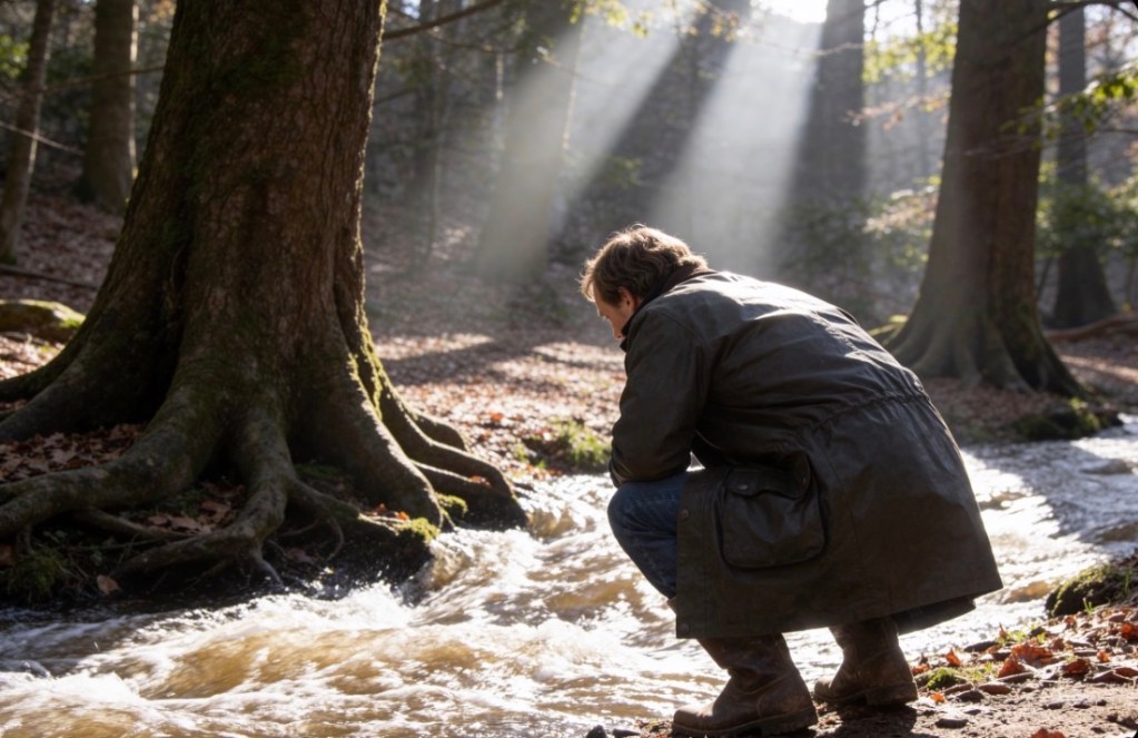 I am in an ancient deciduous wood on a muddy path by a flooding stream. What strikes me first is my childlike curiosity and delight. I recognise this place immediately. I have taken myself into this environment many times in waking life: escaping into woodland, watching water move, swirl, disappear, and re-emerge. In the dream, I am fascinated by how the water finds its way into the earth at the base of a mature tree.